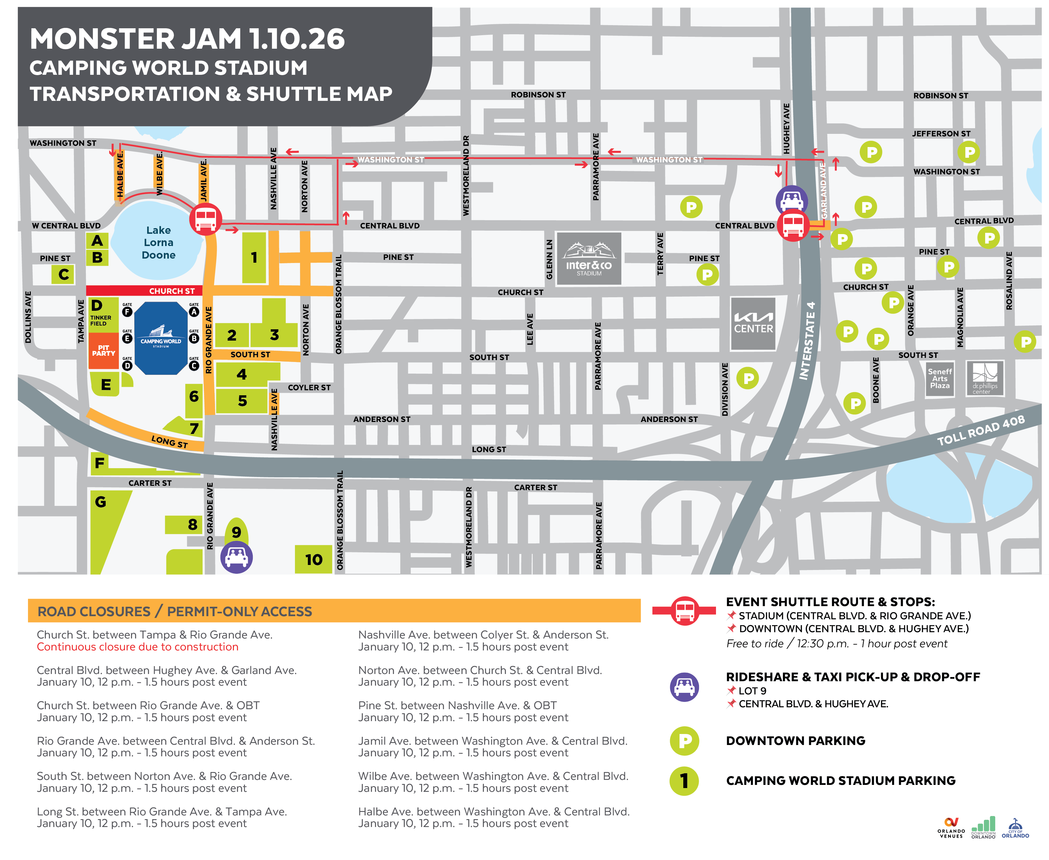 Heading to Camping World Stadium to see Monster Jam on January 10? Our official event guide has everything you need for a smooth and unforgettable experience! Get the latest parking updates, shuttle route info and a full event day timeline to plan your night with ease.