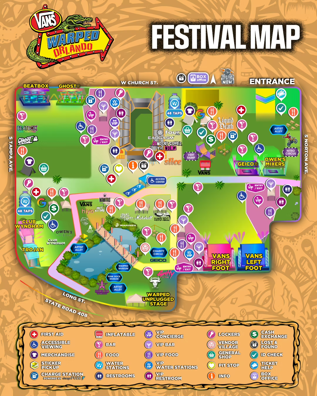 There will be an Accessible entry lane, located at the entrance to Vans Warped Tour Orlando. Disabled guests may use this entrance to safely enter the venue. After using Accessible entry, please visit the Accessibility Services hub located next to Lost and Found, immediately after so that you can keep using accessible entry for the following show days.