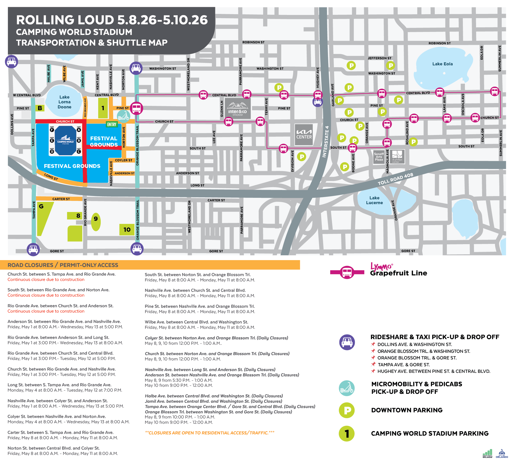 Premier parking is located in Lot 1 on the northeast corner of west Church St. and Rio Grande ave. The entrance to the lot is off of W Central Blvd (north end of the lot). This location is closest to the main entrance and box office for easy access to the event! Parking Lots open at 12pm each event day.